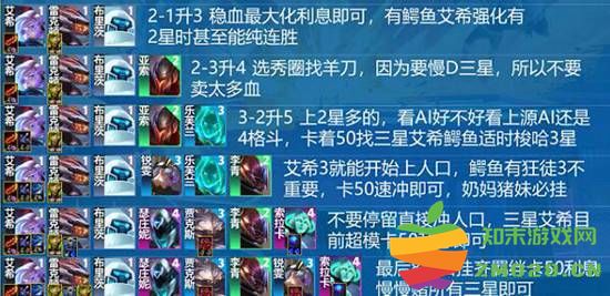 3.运营思路:2-1升3在稳血的同时实现最大化利息;2-3升4找羊刀,但是不要为装备去卖血,因为是中期提速阵容血量很重要;艾希3星后上人口,鳄鱼看情况3,最后8人口慢d三星。