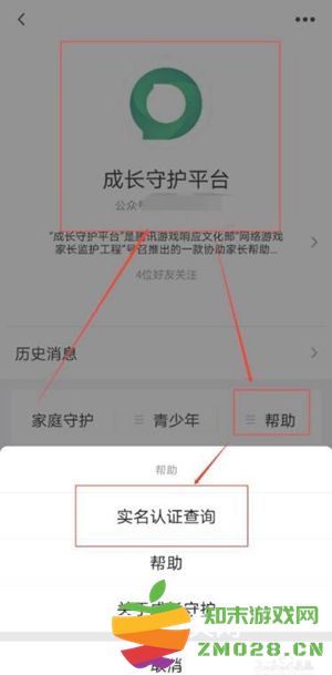 1、使用手机微信,搜索“腾讯成长守护”公众号;关注公众号,进入点击“帮助”选项。有个‘’实名认证查询”,点进去。