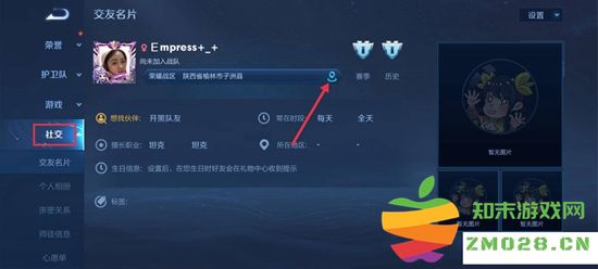 2.点击左下角的“社交”,进入社交界面后可以看到右边的荣耀战区选项,点击战区右边的定位图标;