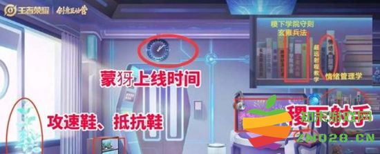 2、上图中的时钟是蒙犽上线时间,门口的柜子里可以看到攻速鞋和抵抗鞋,在右侧的书架上可以看到稷下学生、超远射程教学等关键词;