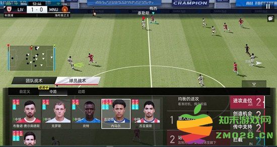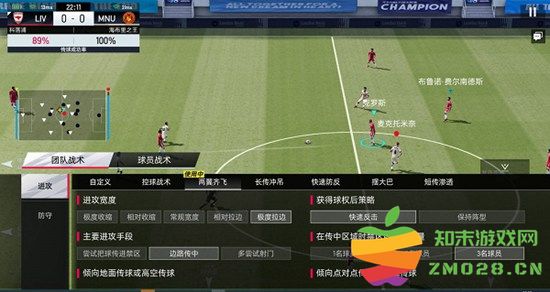 4、团队战术:玩家可通过「团队战术」自由制定球队的整体进攻与防守战术,完成场上的宏观战术调整,当然也可直接选择现有的成套战术,如:两翼齐飞;快速防反等,并且支持在现有成套战术上进行细节微调。