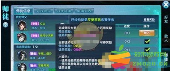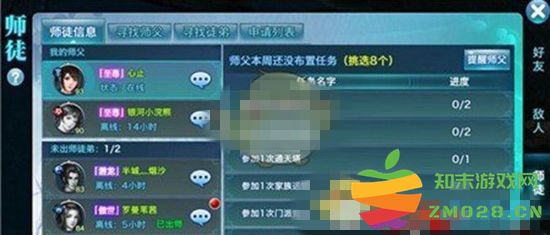 现在全新的师徒任务的任务选项共有12个,师傅可以选择其中八个安排给徒弟,徒弟完成并汇报之后,师傅获得大量名望,徒弟获得大量经验。