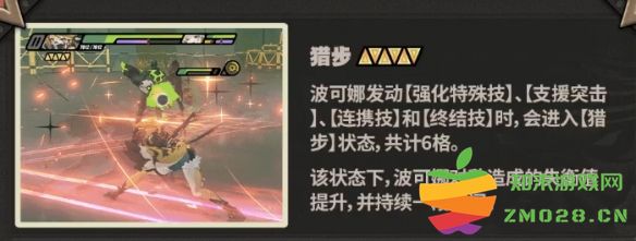 波可娜发动【强化特殊技】、【支援突击】、连携技】和【终结技】时,会进入【猎步】状态,共计6格。