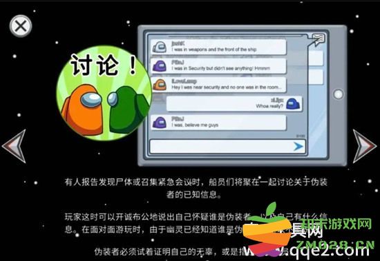 4、有人报告发现尸体或召集紧急会议时,船员们将聚在一起讨论关于伪装者的推断和线索。讨论过后,就把票投给认为是伪装者的人。得到最多票的人会遭到驱逐离开飞船。