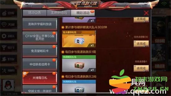 3、活动,游戏官方也会时不时在游戏中开放活动,比如:火线每日礼,完成活动任务可以获得宝箱,宝箱中可能会开出钻石。