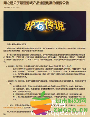 由于我们与合作方暴雪娱乐的协议期限即将届满,在中国大陆地区由上海网之易网络科技发展有限公司所运营的《魔兽世界》《炉石传说》《守望先锋》《暗黑破坏神III》《星际争霸II》《魔兽争霸III:重制版》《风暴英雄》(以下统称“暴雪游戏产品”),将于2023年1月24日0时终止运营,现将终止中国大陆地区运营相关事项通知如下: