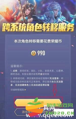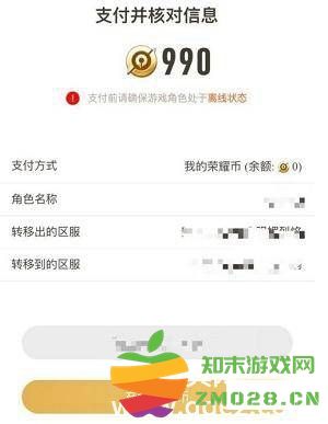 6、充值990荣耀币进行支付,角色处于离线状态即可从安卓转移至苹果。