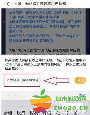 5、仔细阅读跨系统转移用户须知,在下方收动输入【我已知悉以上须知内容和风险】,点击确认;