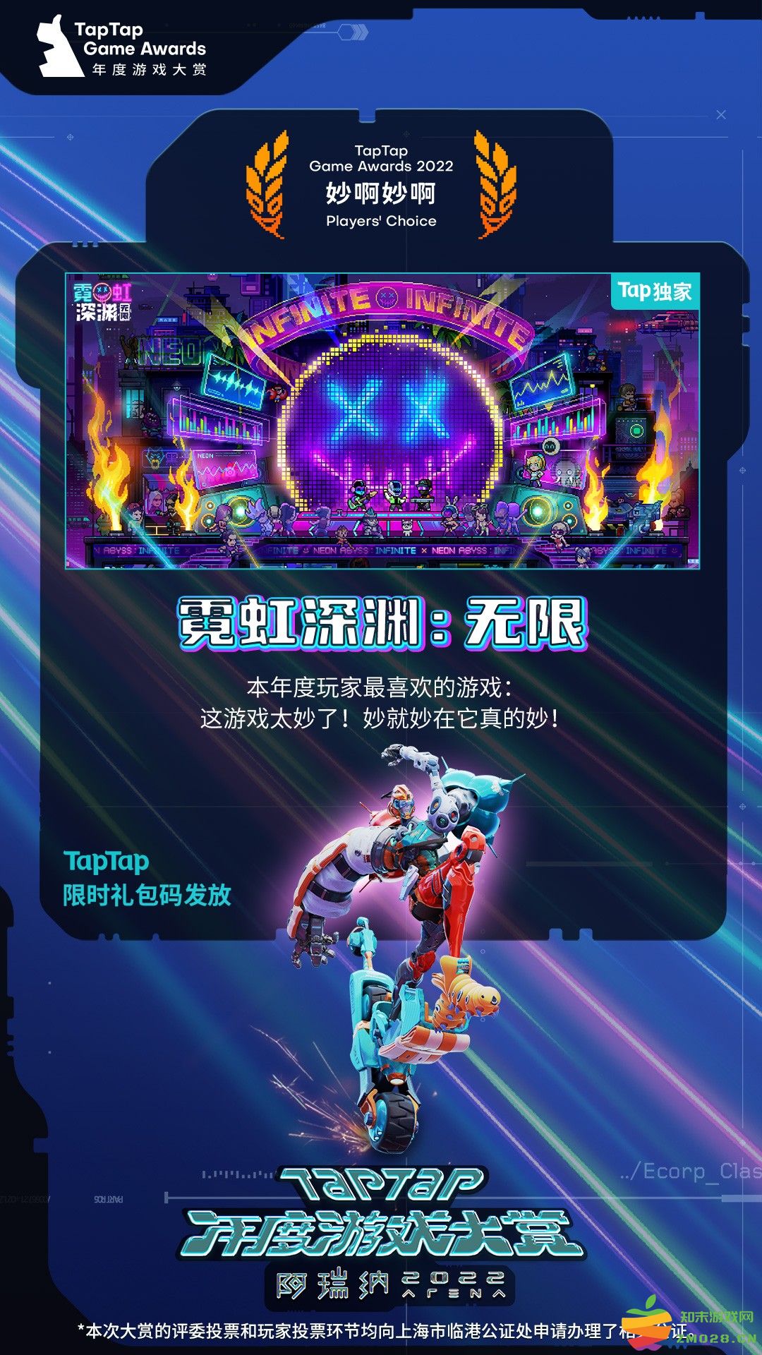 除了专业奖项外,TapTap也为这届大赏呈上了更“新”的菜式:“全新升级的玩家奖项”!别样的命名方式带来“有趣”的第一印象,“妙啊妙啊”、“我的老Baby”、“新的风暴”、“一直有人爱”、“搞快点儿”,全部由玩家票选得出入围名单和获奖游戏。奖项数量的新高也代表TapTap愿意重视玩家的感受和意见。在收获150w张选票后,《霓虹深渊:无限》、《原神》、《明日方舟》、《泰拉瑞亚》等游戏顺利突围进入围名单。