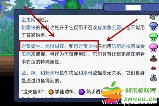 只有使用防熔岩虫网才能捕捉到地狱鱼饵岩浆蜗牛、地狱蝴蝶和熔岩萤火虫,使用这三种鱼饵即可让玩家在地狱岩浆里钓鱼,鱼竿任意均可。