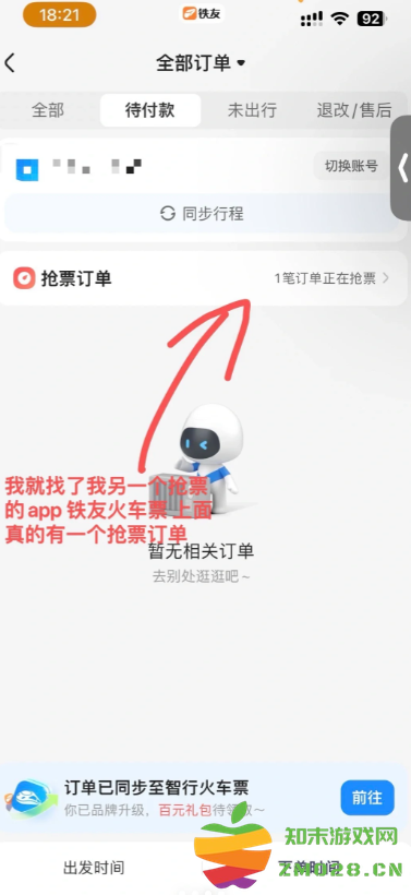 我就找了我另一个抢票的app, 铁友火车票上面真的有一个抢票订单;