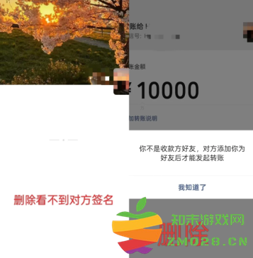 删除: 尝试转账显示你不是收款方好友,朋友圈的个性签名也看不到。