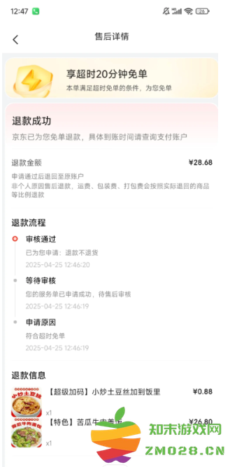 原本预计12:24送达,超时12.45分才送到,刚好超时21分钟。但是没看到有任何提示或是可以操作的选项,没想到是要订单完成后,系统会自动识别你此单是否超20分钟,直接启动“超时免单”,退款不退货!