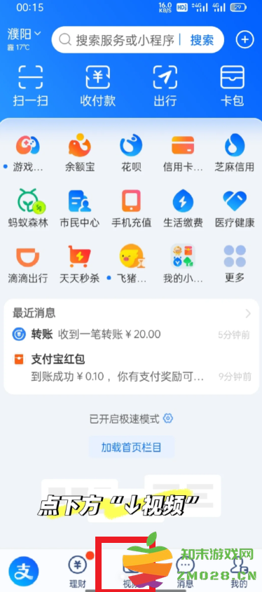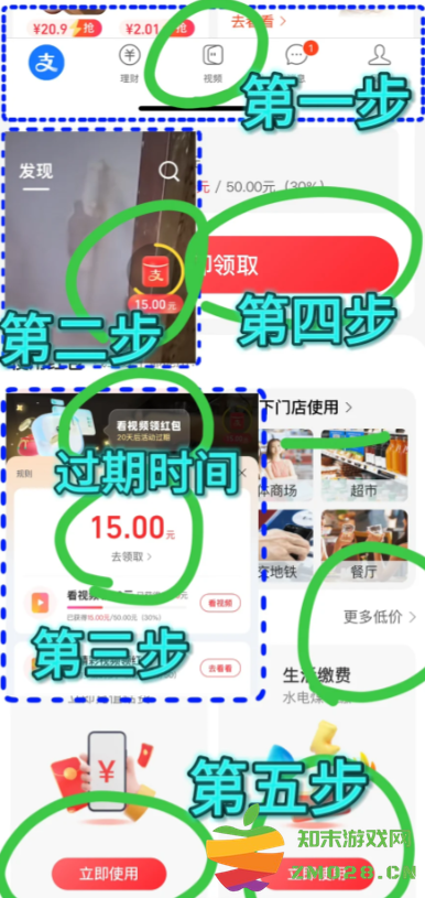 首页最下面中间,点视频,参加“发现”页刷视频领红包活动。在规定时间内刷满红包金额后领取,点右上角的红包能看到目前进度和剩余时间。获得的红包线上线下都能使用,买东西或交话费水电费之类的很合适。