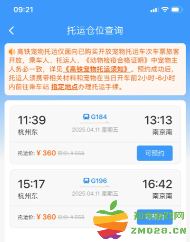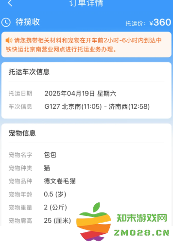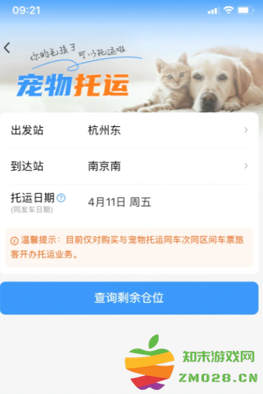 4月8日起,铁路部门将在京沪高铁部分车次试点“隔离运输、人宠分开、专人看护”的高铁宠物托运服务,旅客提前2天及以上线上预约,预约成功后可同车托运1只家庭驯养且健康状况良好、单只体重不超过15公斤、肩高不超过40厘米的猫、犬类宠物。下面看一下具体的预约流程: