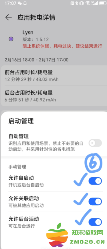 ②在设置找到电池,下滑找到lysn,点击启动管理,将所有选项都打开。