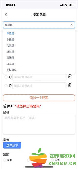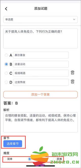 3、编辑好试题、答案与解析,最后我们可以选择导入相应的章节和试题难易度,这样一道试题就成功导入了。