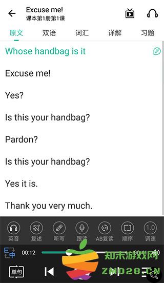 6、课程页游原文和双语两种模式切换,底部还可以选择“复述”、“听写”以及“调速”等快捷功能,帮助你根据自己的学习需要来调整。