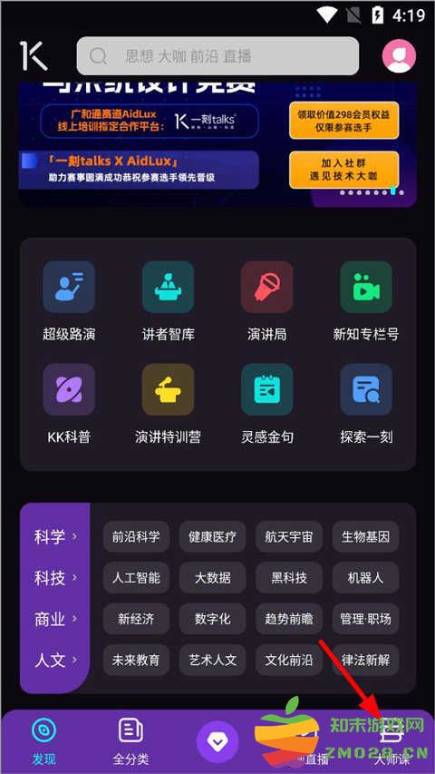 1、打开一刻Talks app并登录账号,进入首页后点击底部导航栏中的“发现”,浏览超级路演、讲者智库、演讲局、KK科普等内容模块,选择“大师课”进入;