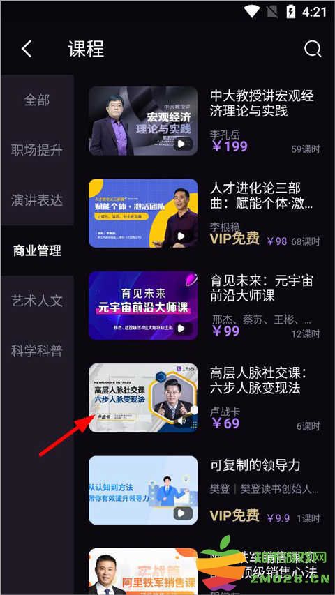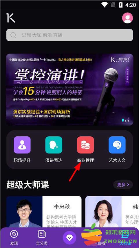 2、进入“大师课”页面后,可按职场提升、演讲表达、商业管理等分类查找课程,点击相应类别继续浏览;